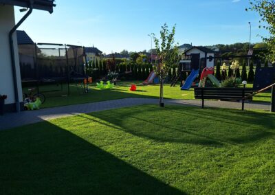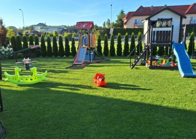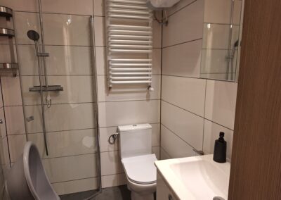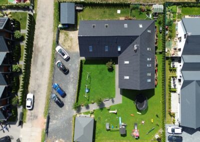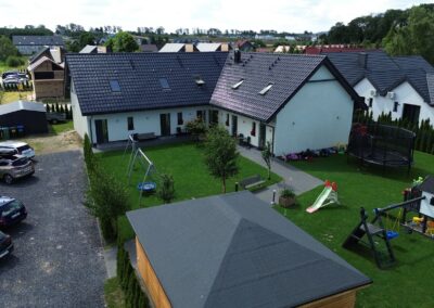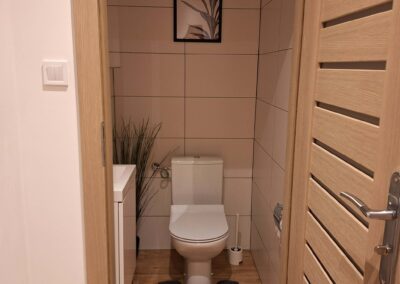 Każdy apartament posiada pokój dzienny z aneksem, łazienkę, 2 sypialnie, toaletę na piętrze oraz taras.